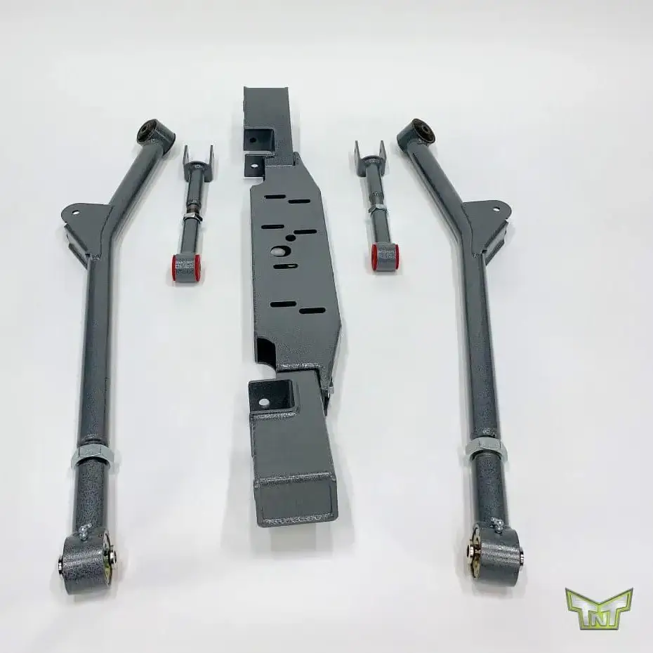 This image showcases the key components of the TNT Customs Long Arm Suspension Kit, built to enhance the off-road capabilities of your Jeep. Featuring heavy-duty lower control arms, upper adjustable arms with red bushings, and a robust center crossmember, this system is designed for strength, improved articulation, and better ride quality on rugged terrain. TNT Customs’ signature powder-coated finish offers corrosion resistance and sleek appearance, making it ideal for both performance and style upgrades.